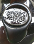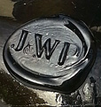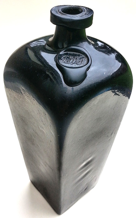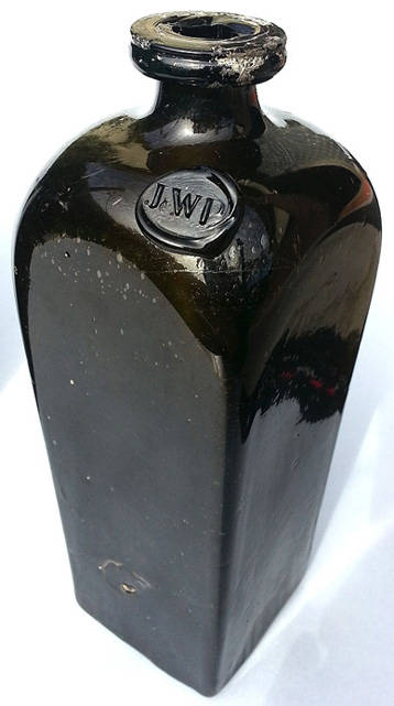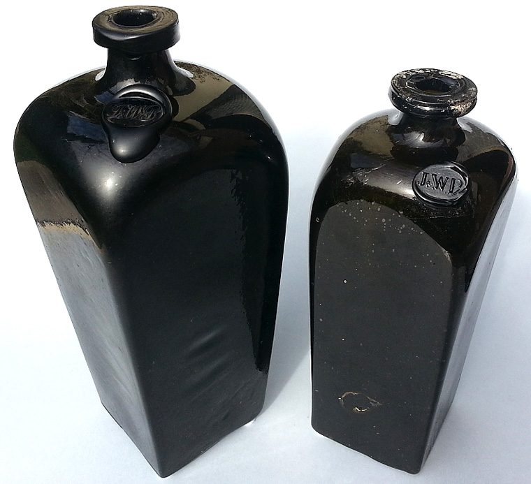| These fine examples of J&WP sealed gins, 24.5 cm. high and a very rare 21.5 cm. smaller size - the bottle on the right - which feature the superb flat rim top and very dark glass. Both of these bottles were dug from the ground in Melbourne, Australia in fantastic condition. |