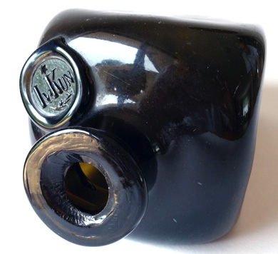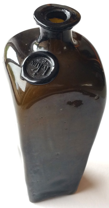 page is a magnificent example of an early freeblown black glass gin.