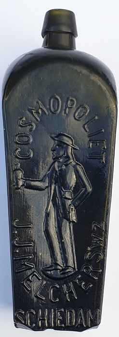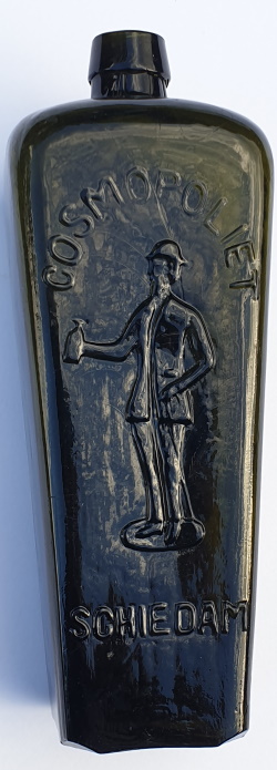 MAN gin bottles are widely recognised as a desirable addition to any bottle collection. It is interesting to note that there are a variety of embossing styles, glass colours and bottle shapes and sizes. Closer scrutiny of the embossed MAN in the above 3 bottles reveals some subtle differences, including : >> Different type of hats >> Position and placement of the walking cane >> Facial features and clarity >> Fingers and thumbs holding the outstretched bottle - only visible on one bottle >> Coat pocket - all different - from none visible, to coat pocket, then bottle on right is actually a pouch with shoulder strap >> Coat style and lapels are all different |